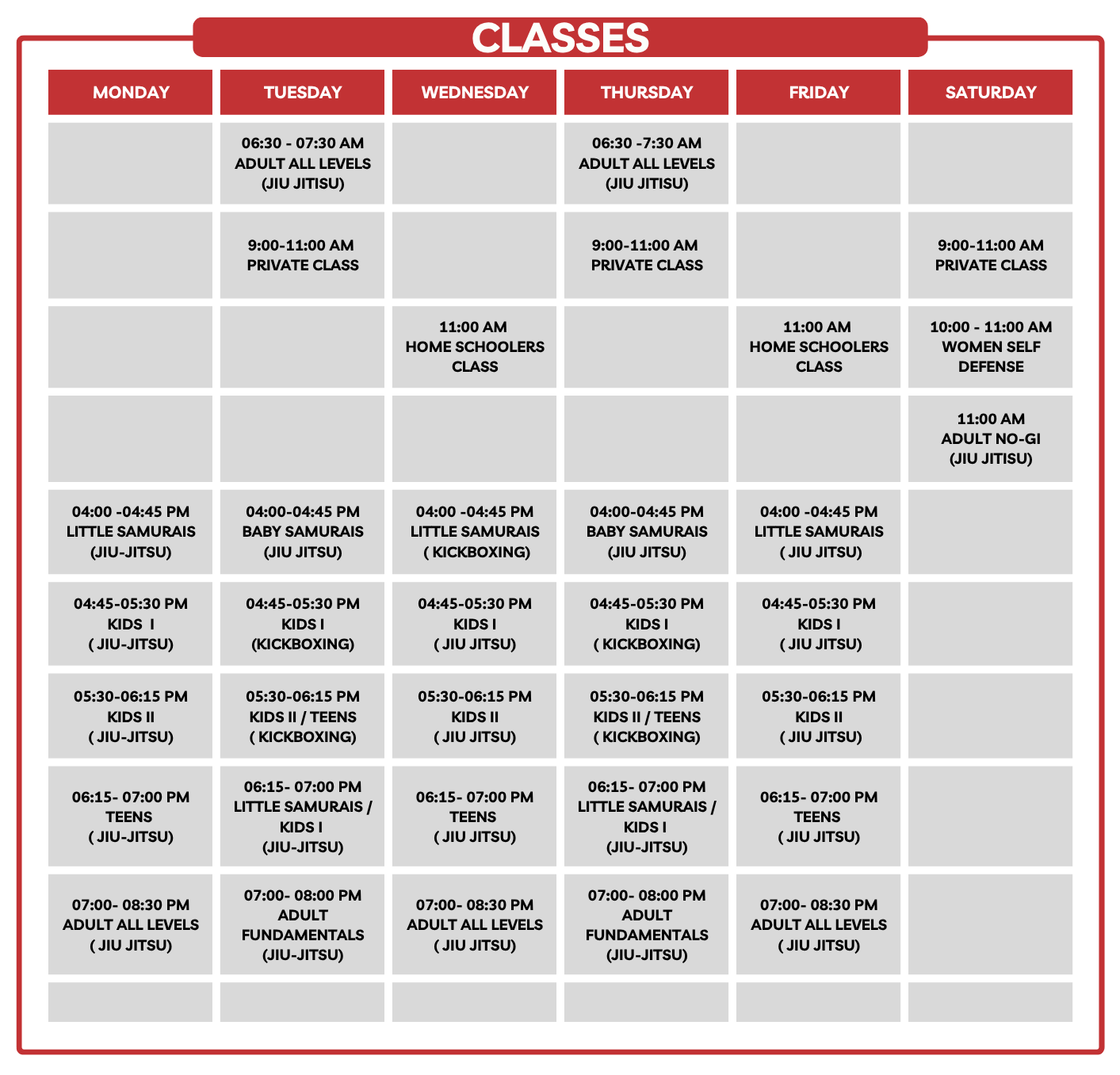 We offer Brazilian Jiu-Jitsu, Kickboxing, Wrestling, Judo, and Women’s Self-Defense classes! We ensure our students receive top-quality instruction in all martial arts styles!