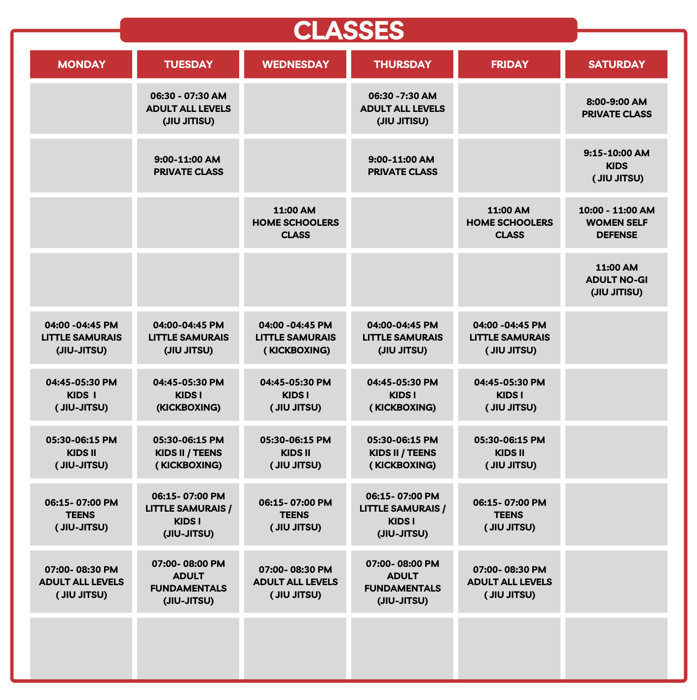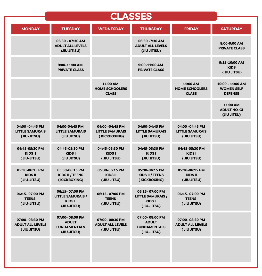 We offer Brazilian Jiu-Jitsu, Kickboxing, Wrestling, Judo, and Women’s Self-Defense classes! We ensure our students receive top-quality instruction in all martial arts styles!